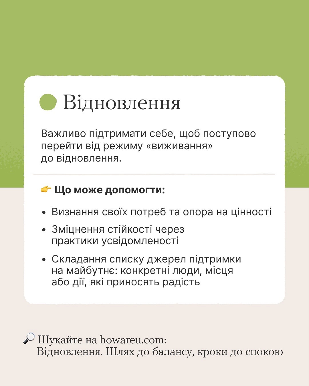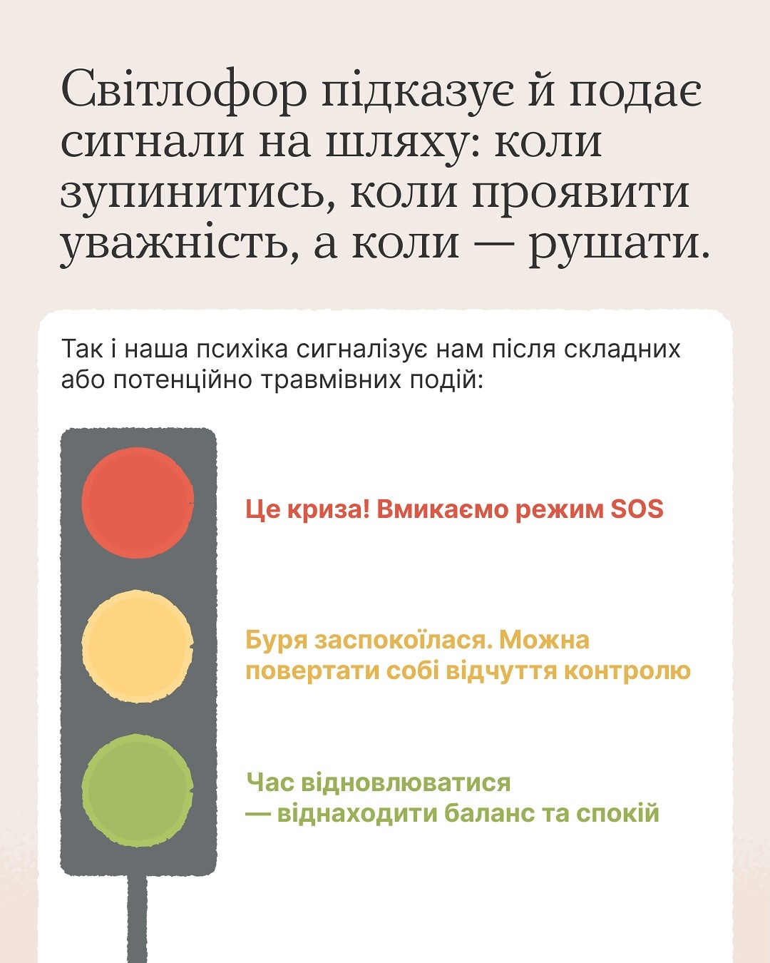 На платформі «Ти як?» @howareu_program Всеукраїнської програми ментального здоров’я є орієнтири, які помічні у цьому — алгоритми самодопомоги під час кризи, після бурі та на шляху відновлення.