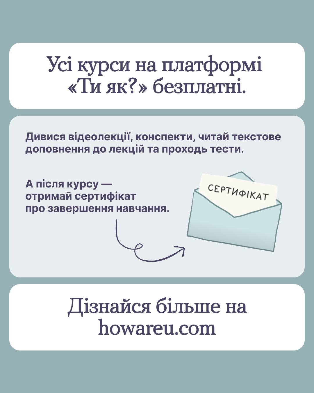 Разом із провідними експертами освітньої платформи «Ти як?» освоюй навички підтримки ментального здоров’я, корисні практики та щоденні інструменти самодопомоги.