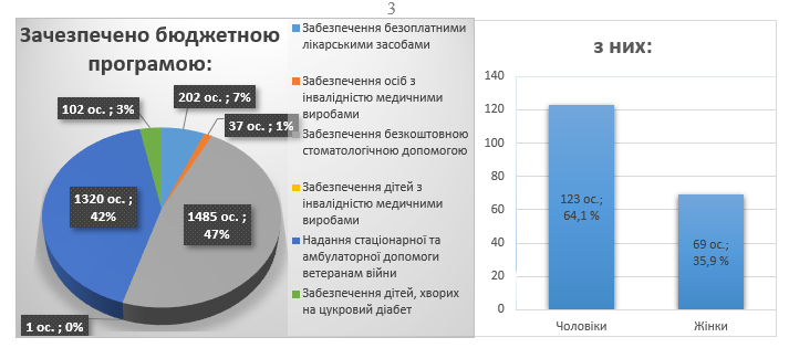 -надання стаціонарної та амбулаторної допомоги ветеранам війни у тому числі учасникам бойових дій – 1 320 осіб на загальну суму 375,1тис.грн, з них: 1030 чоловіків та хлопчиків (78 %) на суму 343,9 тис. грн (у середньому на одну особу - 333,9грн) та 290 жінок та дівчаток (22 %) – 31,2 тис. грн (у середньому на одну особу – 107,6 грн).