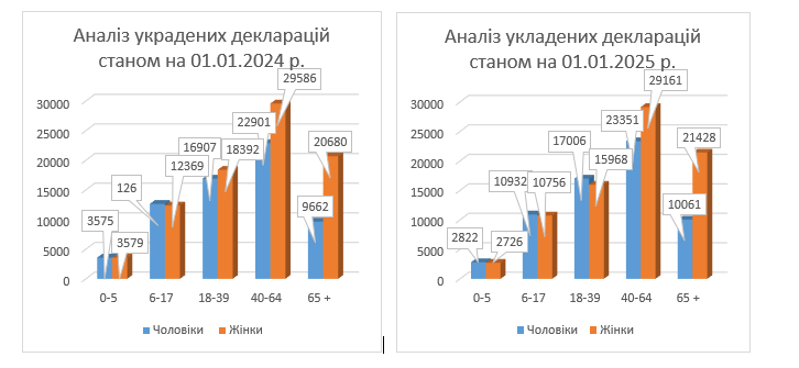 Станом на 01 січня 2025 року сімейними лікарями укладено декларації з 144 211особами, що на 4,1 % менше у порівнянні з 01 січня 2024 року (150 300 особи), з них: