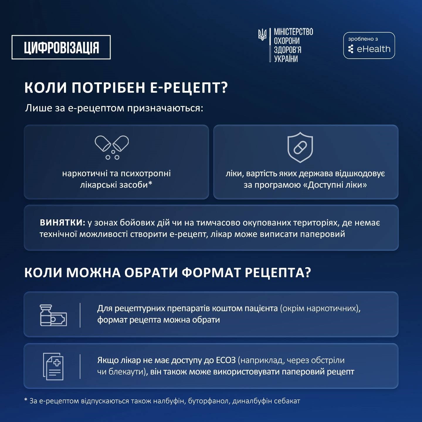 Е-рецепт — це цифровий медичний документ, який створюється в ЕСОЗ на основі медичних записів про стан пацієнта. У ньому зазначається призначення лікаря щодо лікарського засобу за його міжнародною непатентованою назвою (тобто діючою речовиною)